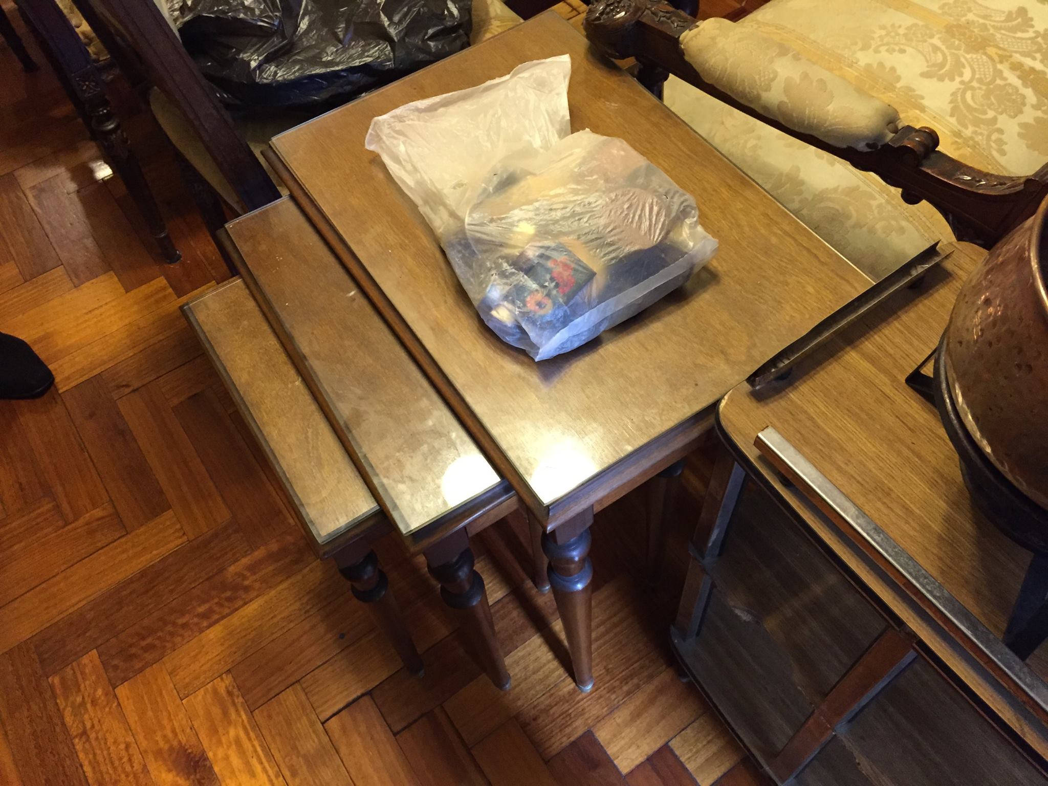 3 DE FEBRERO 2065 PISO 3. Cantidad de adornos, muebles de estilo, cómodas, mesas de luz, mesitas de bronce, lámparas, biblioteca, libros, metal plateado, heladera doble puerta ge, microondas, varios juegos de cubiertos uno en mueble , gobelino, perchero valet, vajilla, fina cristalería, máquina de coser con mueble, samobar, camas de bronce, cantidad de art de gastronomía cortadora de fiambre, chocolatera cascada, platos, cacerolas grandes, mesitas, ventiladores de techo, relojes de mesa, tv, comedor diario formica y caño, arañas, jarrones, espejos, art de cocina y mucho mas